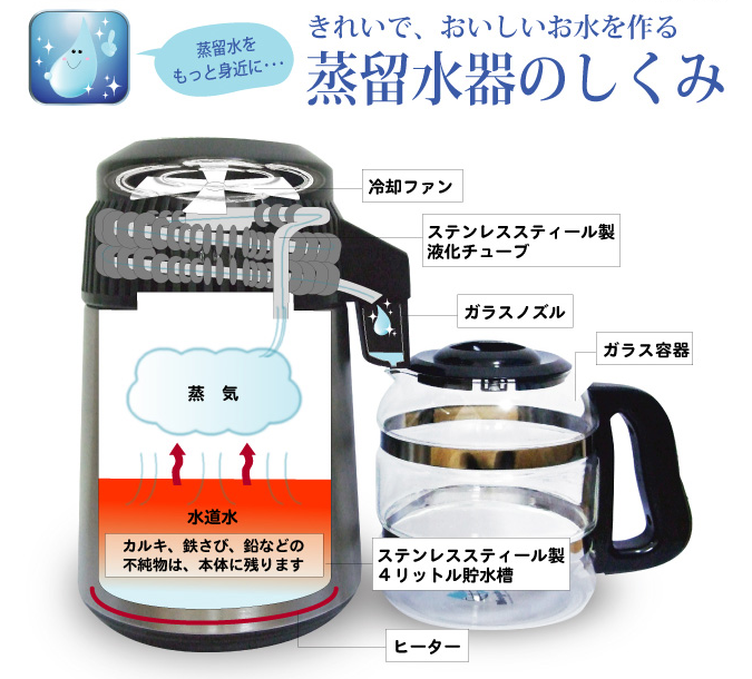 メガキャット本体に水道水を入れるだけで、簡単に蒸留水が出来ます。 電気代は1回約70円。 本当に家庭で安心して飲めるお水が蒸留水なのです。